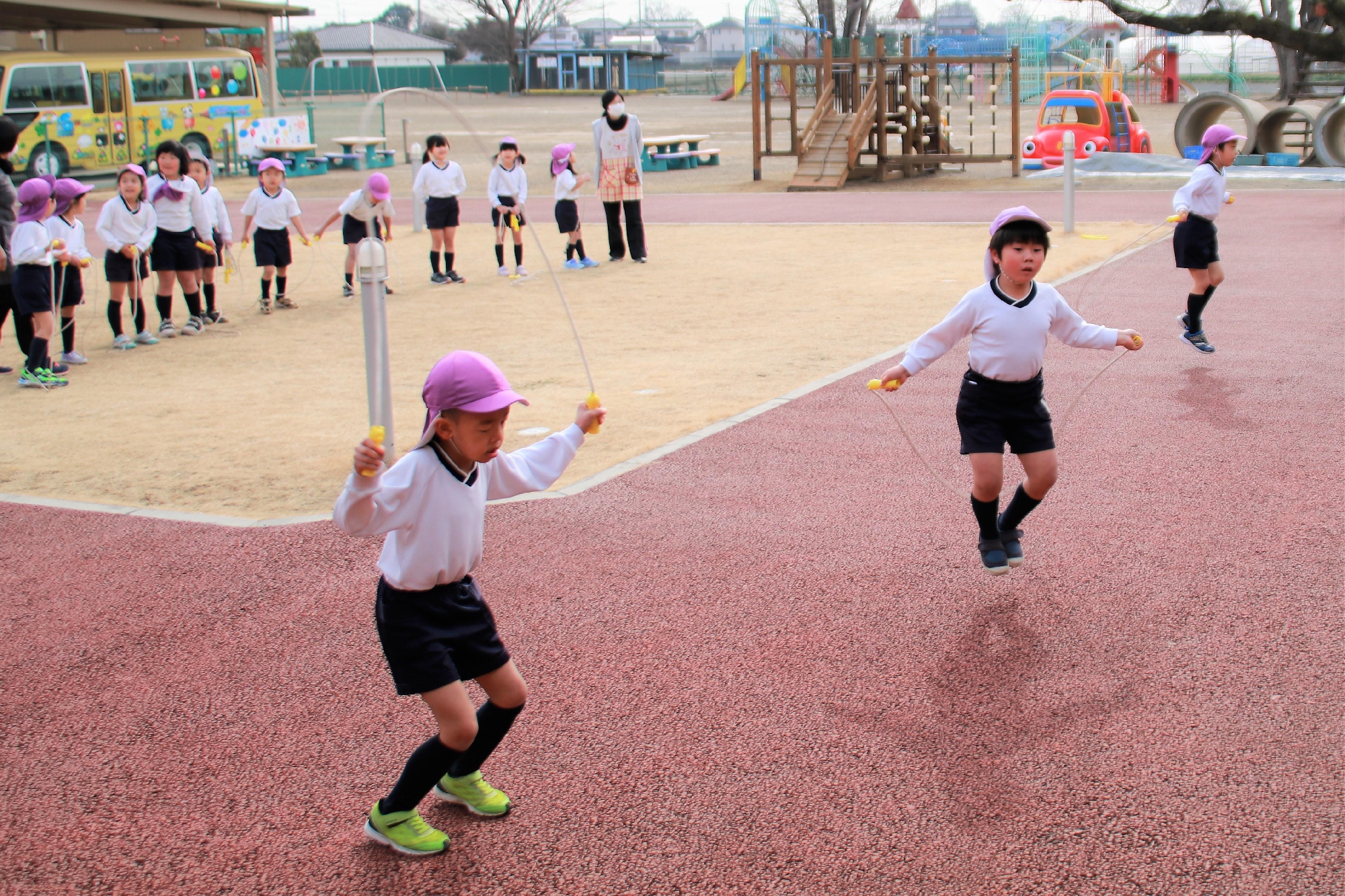りすぐみのお友達は、ロータリーを走り縄跳びで回りました。うさぎ、きりんぐみのお友達は、1分間で何回跳べるかの挑戦でした。