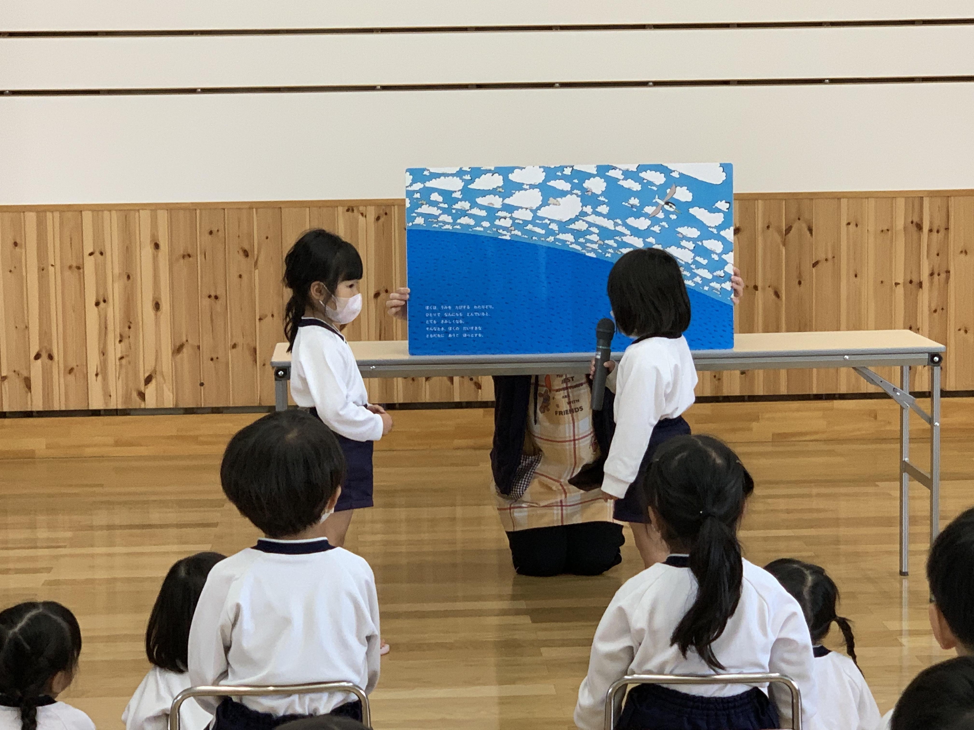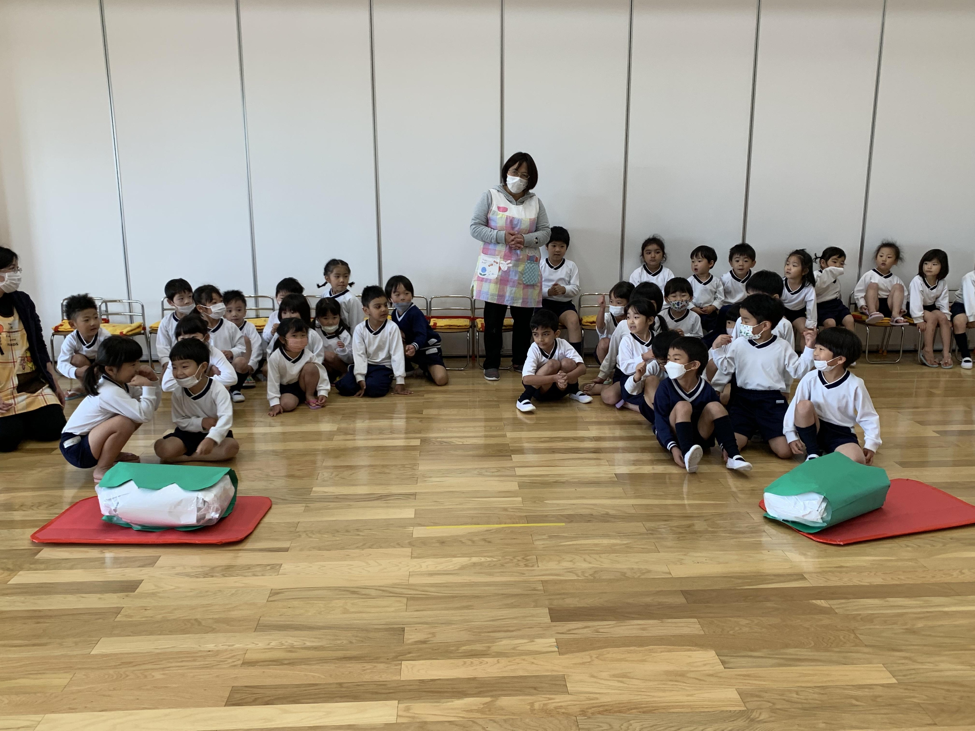 うさぎぐみの子が大型絵本を読んでくれたり、うさぎぐみときりんぐみで2チームに分かれ、かしわもち運びゲームをして楽しみました😄