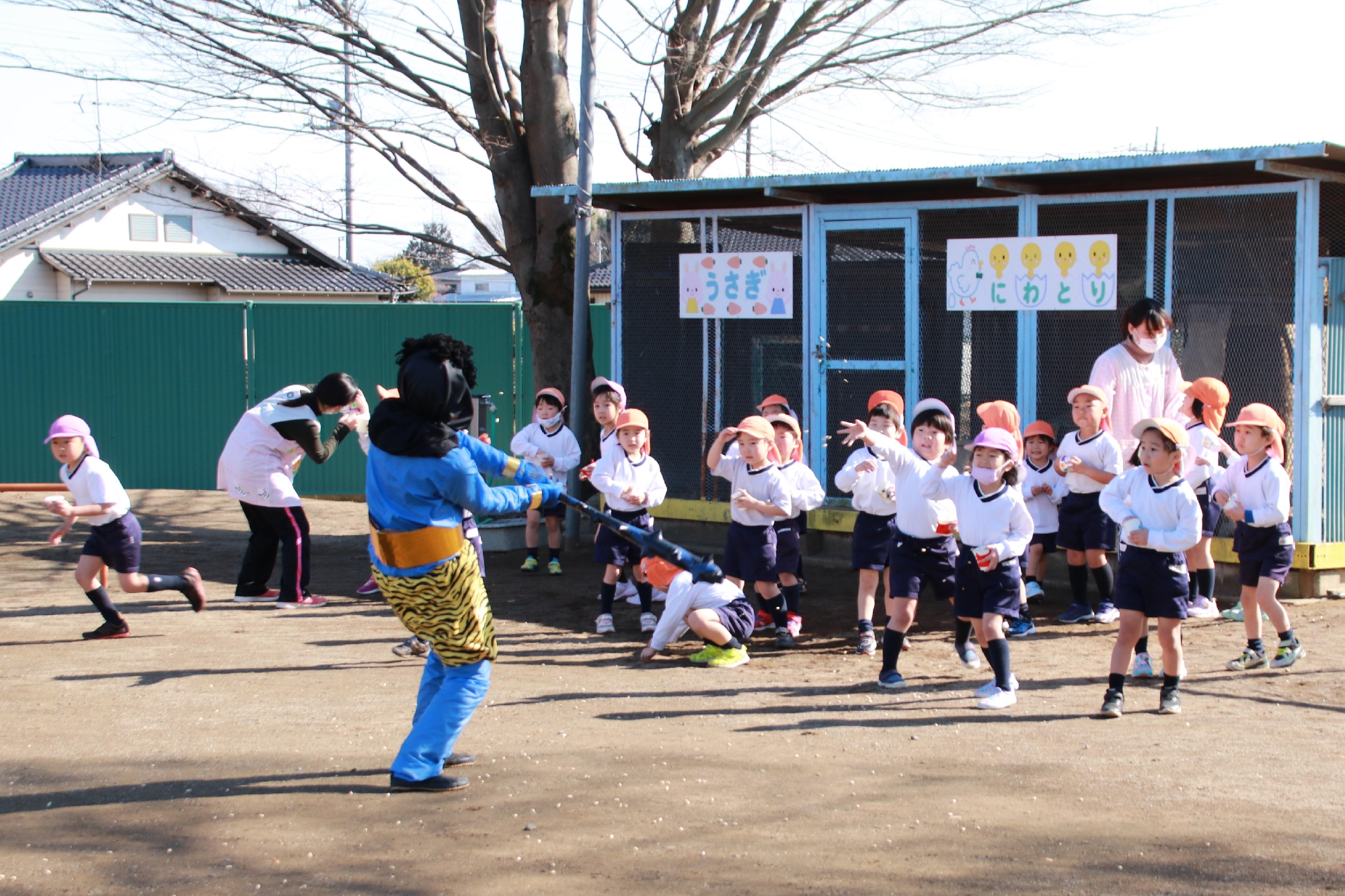 豆まきを行いました。鬼の登場にびっくりし、泣き出してしまう子もいましたが、豆をぶつけることは出来ました😊