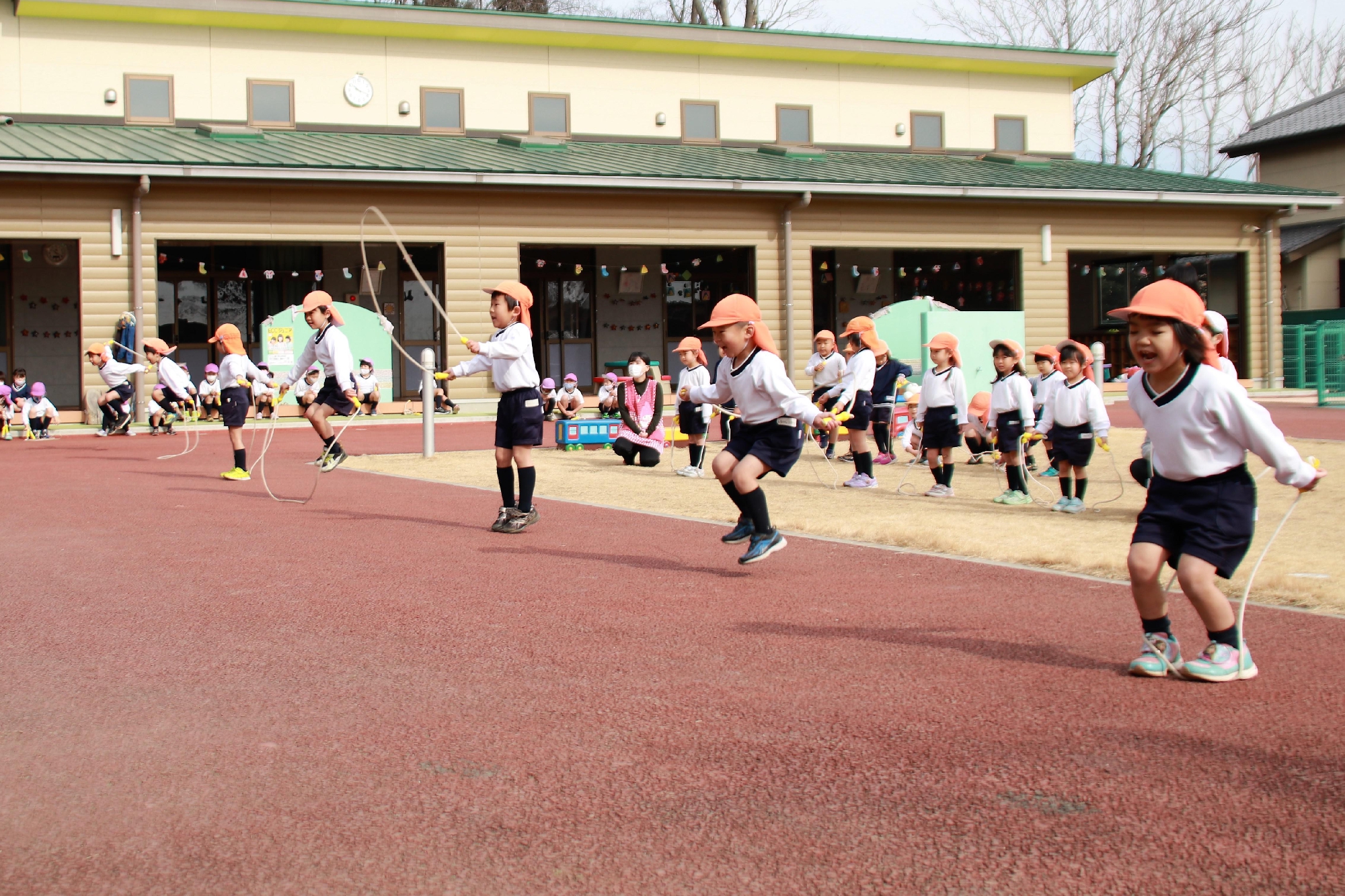 りすぐみのお友達は、ロータリーを走り縄跳びで回りました。うさぎ、きりんぐみのお友達は、1分間で何回跳べるかの挑戦でした。