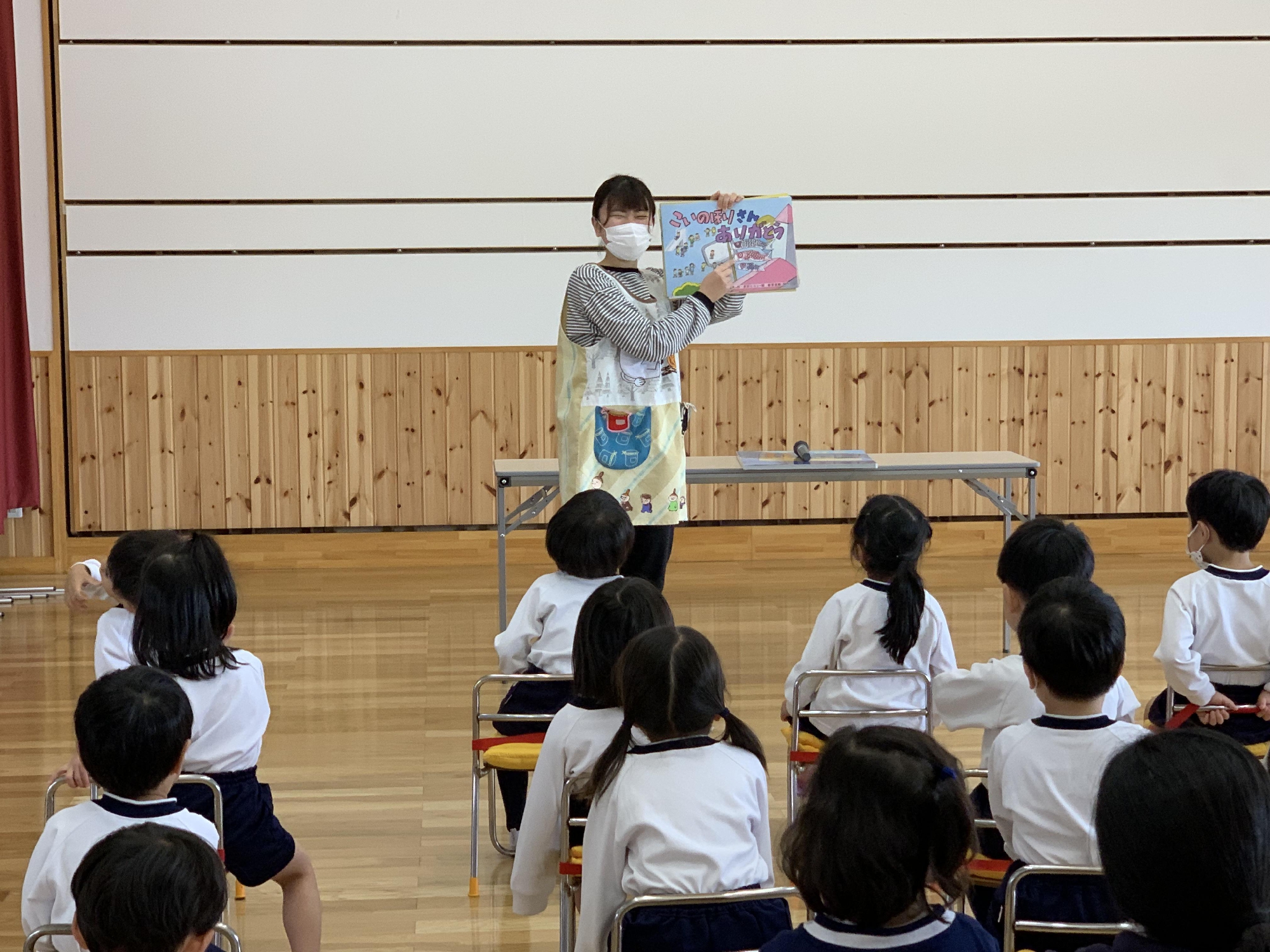 うさぎぐみの子が大型絵本を読んでくれたり、うさぎぐみときりんぐみで2チームに分かれ、かしわもち運びゲームをして楽しみました😄